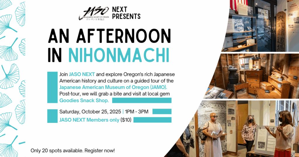 Join JASO NEXT and explore Oregon’s rich Japanese American history and culture on a guided tour of the Japanese American Museum of Oregon (JAMO). The museum is located in the historic Old Town neighborhood, where Nihonmachi (Japantown) once thrived. Post-tour, we will grab a bite and visit at local gem Goodies Snack Shop, only a short 5-minute walk away. Connect with fellow NEXT members while learning more about this local area of Japan-Oregon history!