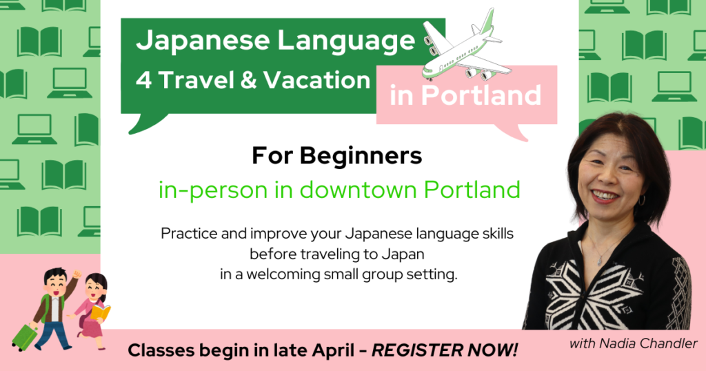 Join us in downtown Portland as we open up our textbooks and practice Japanese together in conversation based around traveling and vacationing in Japan. These classes are for adults 18 years and older. Sorry, no high school students (we do accept in our Salem classes).
