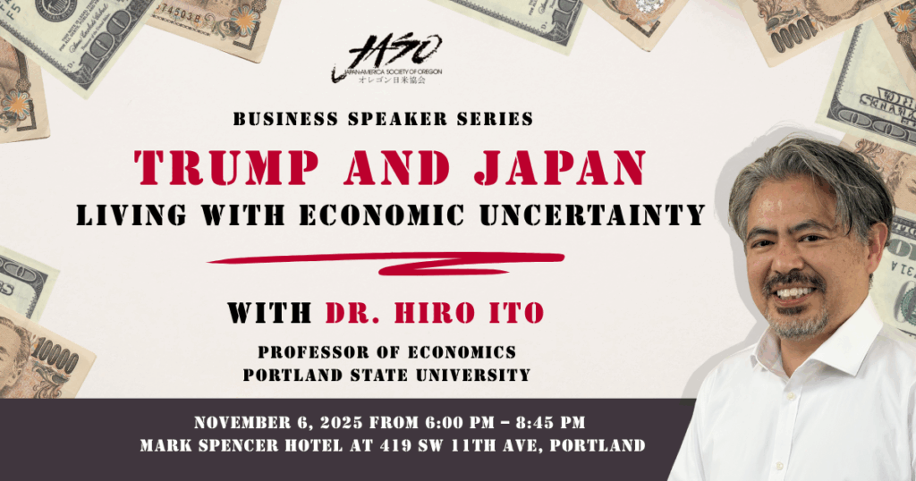 Join us for a fascinating dive into the new reality of uncertain economic, political and business worlds; and how this plays out between the US and Japan. Dr. Hiroyuki Ito, Professor of Economics at Portland State University, takes us on a journey into new territories as he ponders critical questions for our relationship.