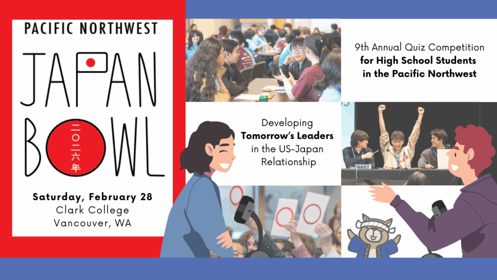 Join high school students and their supporters from across Oregon and Washington in the largest regional quiz competition on Japanese language and culture! In the morning, student teams of two or three answer quiz questions on language and culture, including history, arts, geography, society, and pop culture. After lunch, students have time to visit college booths, network with students from other schools, and enjoy a cultural performance. In the afternoon, finalists test their knowledge on verbal skills, kanji, idioms, and other expressions. JASO submits the Level 3 and Level 4 champion teams to the National Japan Bowl, and flies the teams to Washington, D.C. to compete.